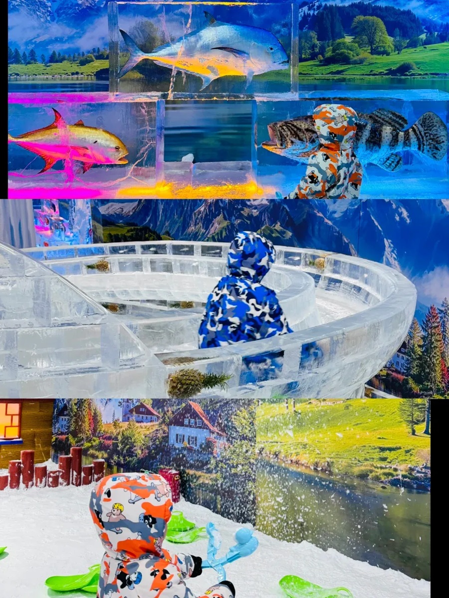 里面修建了聚宝财神、美人鱼岛、一帆风顺等冰雕艺术作品,打造出一个梦幻冰雪童话世界。